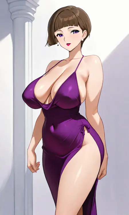 Sonomi, 1girl, mature female, short hair, brown hair, blunt bangs, purple eyes, lipstick