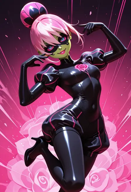 | 训练词汇 | Princess Fragrance, green skin, magenta hair, pink hair, multicolored hair, two-tone hair, bangs, bun, hair between eyes, rosebud-like bun, blue eyes, pink sclera, pink lipstick,已复制! mask, domino mask, black turtlenecked skin-tight suit, puffed sleeves, puffed shorts, Narrow pink lines, black high-heel shoes, black tube came out of the top of the bun, rose design on her chest,已复制! |