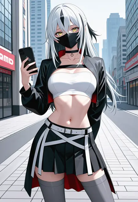 Appearance: long hair, streaked hair, white hair, black hair, hair between eyes, yellow eyes