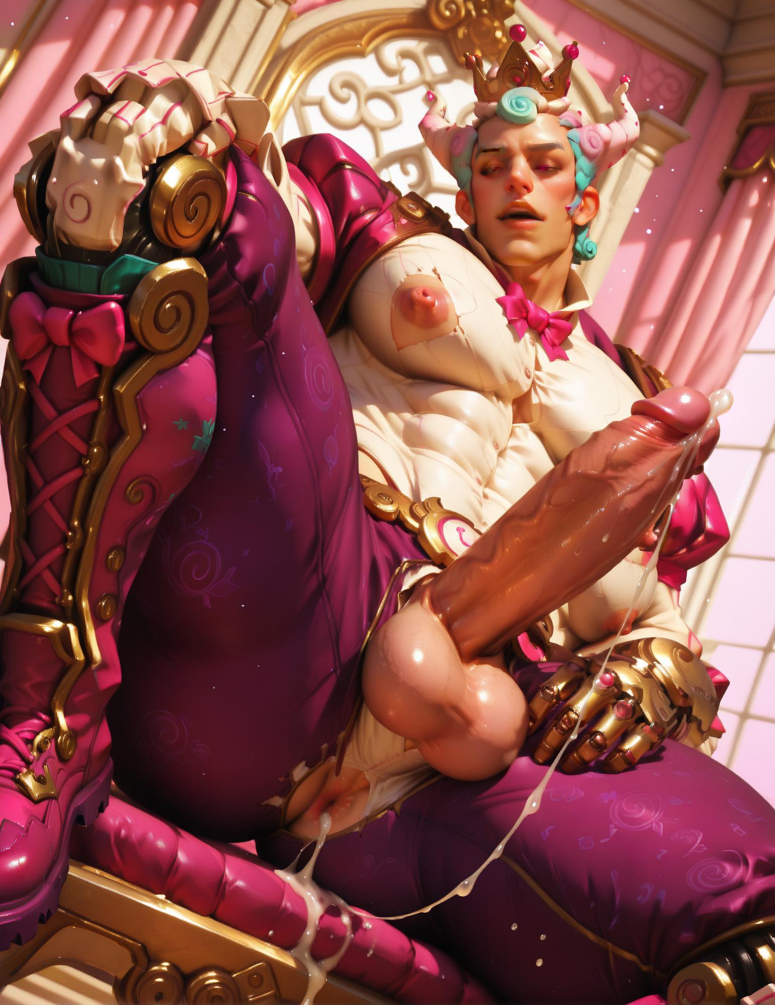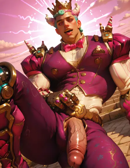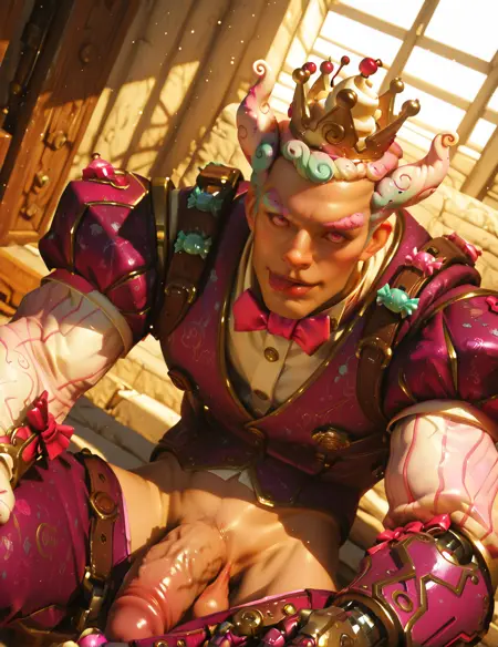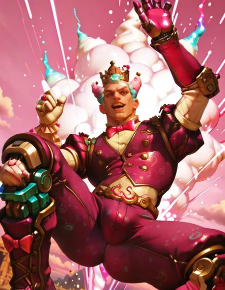 柔色调的高耸卷发,粉红色眼睛,蓬松的眉毛,白色领口内搭衣配金色纽扣,紫色夹克饰以金色细节和糖果主题装饰,粉色蝴蝶结,紫色长裤带有棒棒糖图案。(蓝色机械义肢手臂),白色手套,紫色戒指,糖果装饰的过膝靴,金色腰带,义肢腿,金色王冠顶端覆有鲜奶油和樱桃,