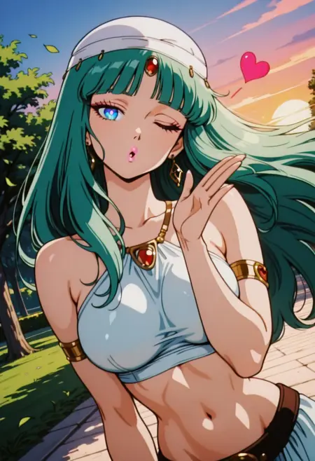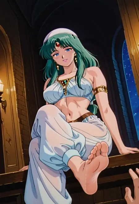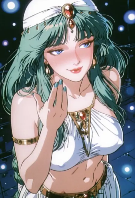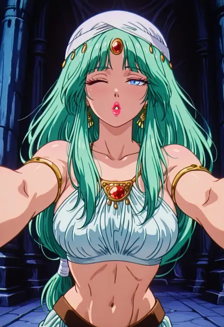LichiaAS, 1girl, solo, green hair, long hair, braid, white hat, hair ornament, blunt bangs, gem, blue eyes, full lips, pink lips, earrings, white crop top, bare shoulders, large breasts, navel, midriff, groin, thick thighs, white harem pants, belt, golden jewelry, large butt, sleeveless, armlet,