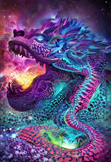 我经常喜欢仅将提示保留为“迷幻艺术 drdjns 风格”,不再添加其他内容,静待它生成的图案与色彩带来的惊喜。该LoRa似乎对它所配合的检查点有较严格的要求,具体建议请参见推荐资源。