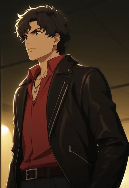 Axel Gilberto: axel gilberto,1boy,solo,male,black eyes,black hair,leather jacket,red shirt,pants,black jacket,jewelry necklace,