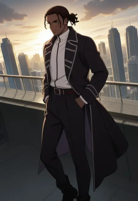 Douglas Hadine: douglas hadine,1boy,solo,dark skin,dark-skinned male,dreadlocks,brown hair,ponytail,glasses,white shirt,black pants,belt,black coat,long sleeves,black footwear,earrings
