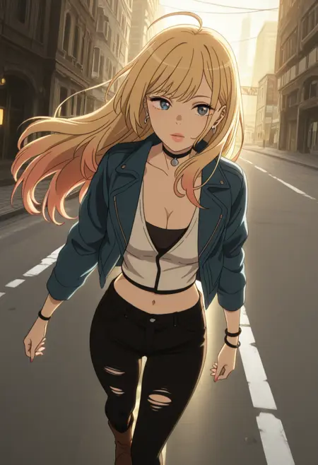 Christine: christine,1girl,solo,blue eyes,blonde hair,ahoge, breasts,cleavage,denim,jacket,black pants,torn clothes,midriff,navel,brown footwear,boots,lips,jewelry,earrings