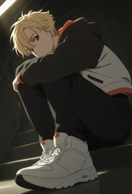 Leland: leland,1boy,solo,male,brown eyes,blonde hair, hoodie,hood,two-tone jacket,multicolored jacket,long sleeves,black pants,jewelry,earrings,shoes,white footwear,sneakers,