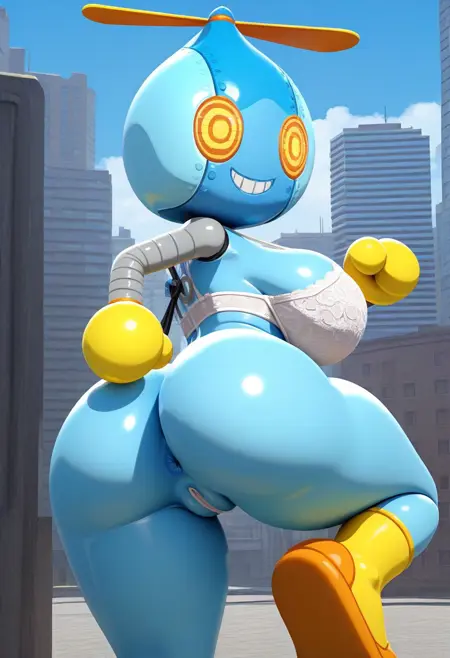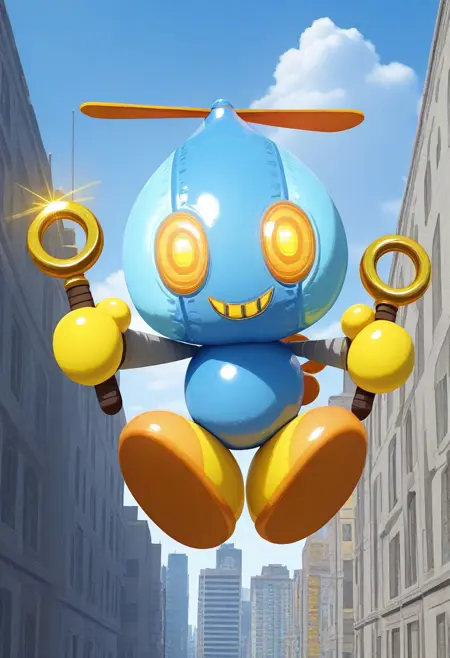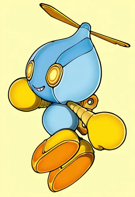 Omochao, blue body, yellow ripple-like eyes, no nose, orange two-bladed propeller on head, gray cable-like arms, smooth yellow feet with orange soles