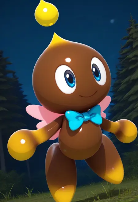 Chocola the Chao, small brown body, round yellow sphere atop of head, large oval-shaped dark blue eyes, small pink wings, blue bow tie, round body