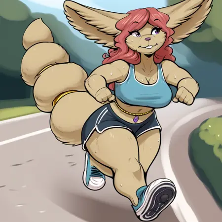 fox, fox girl, fennec fox, tan fur, rose pink hair, long hair, purple eyes, pink nose, large ears, fox tail, tail bands, shortstack, large breasts,