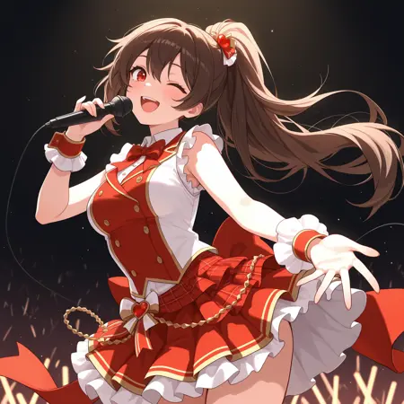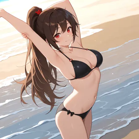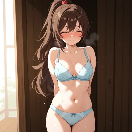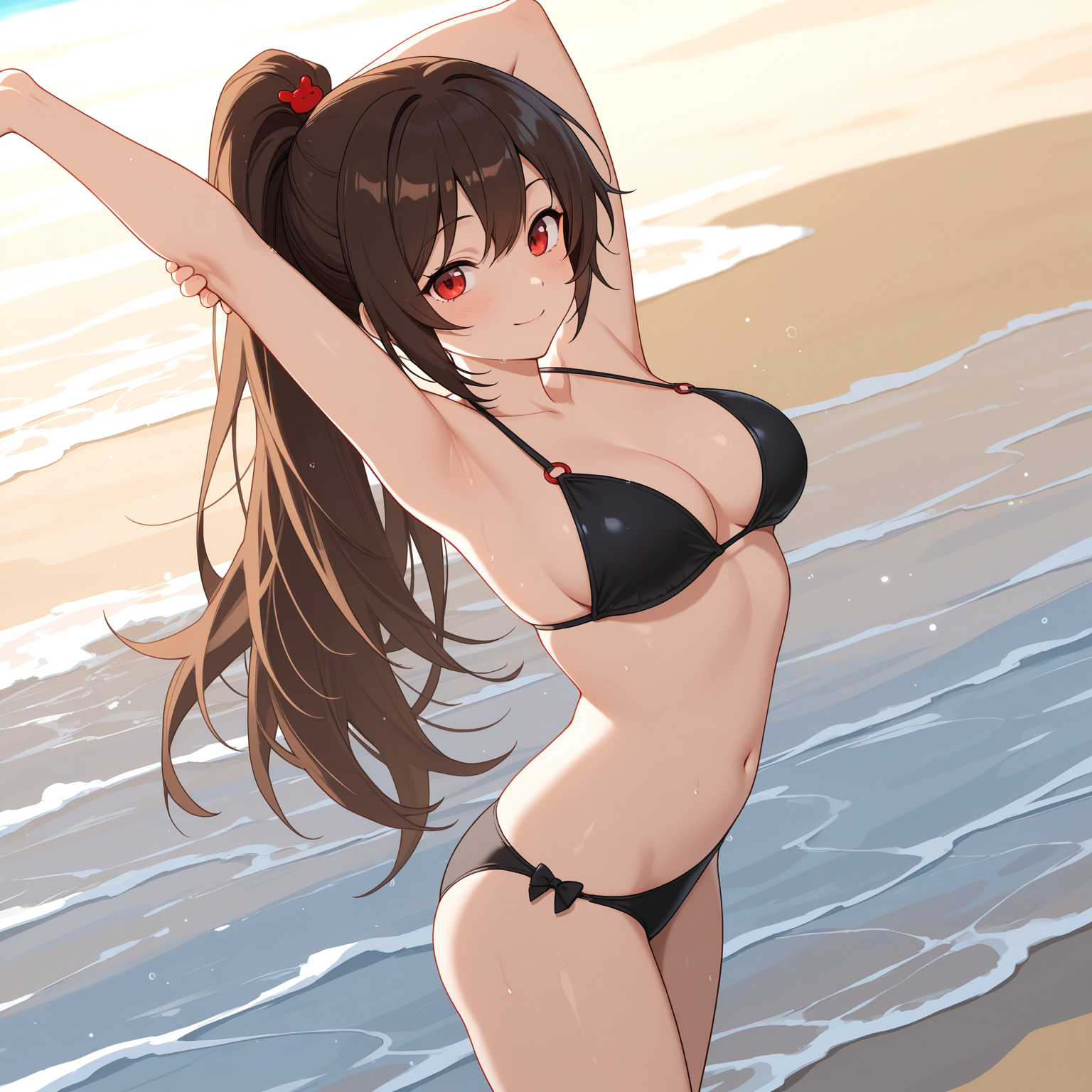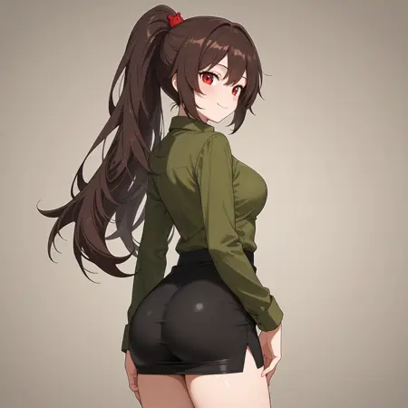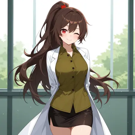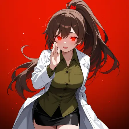 CarmenLC, brown hair, long hair, ponytail, red eyes, hair ornament, medium breasts,