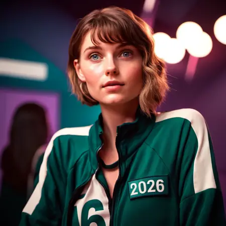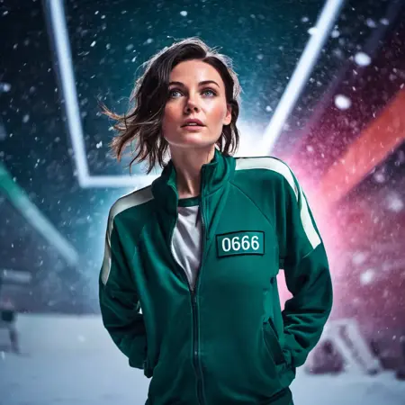 一个.......,穿着受《鱿鱼游戏》启发的绿色运动服,细节丰富,1个人,