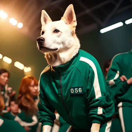 一个.......,穿着《鱿鱼游戏》风格的绿色运动服,站在一群穿着《鱿鱼游戏》风格绿色运动服的人群中,