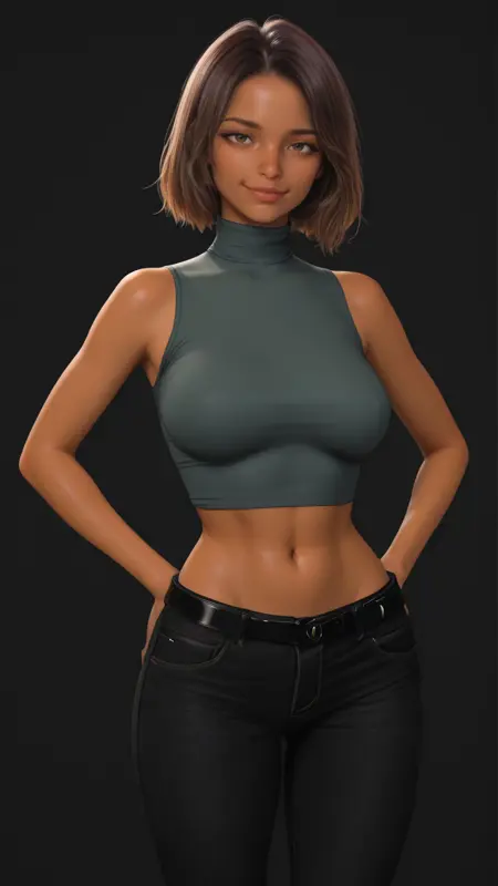 タートルネックシャツ、ぴったりしたシャツ、ノースリーブ、お腹の露出、ローライズジーンズ、黒のデニム、黒いベルト、バックル