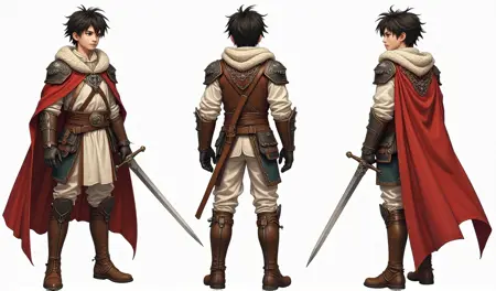 正面図:キャラクターの正面から描かれたもので、顔の特徴、胴体の前面輪郭、四肢の対称的な関係を示します。キャラクターの基本的なプロポーション(例:頭部と体の比率)を決定する基準となります。
