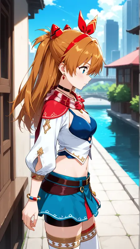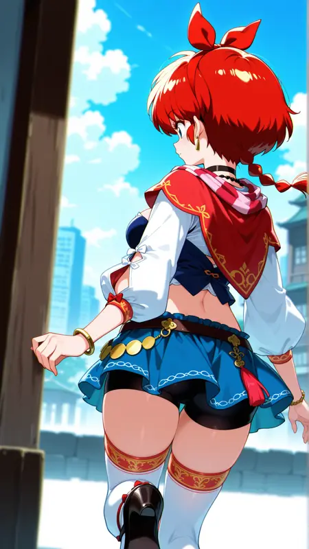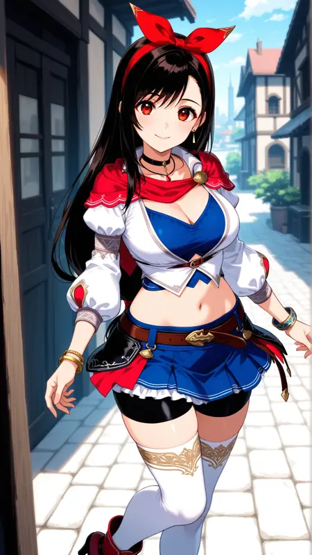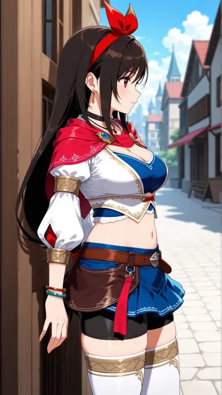 トリガーワード:city_thief\(cosplay\)、ブレスレット、白いハイソックス、腹部、イヤリング、へそ、胸元、赤いキャップレット、黒いチョーカー、赤いリボンヘアバンド、ハイヒール、スカーフ、サンダル、クロップトップ、ネックレス、踝ブーツ、ベルト、長袖、スカートの下にショートパンツ、黒い自転車用ショーツ、ふんわりした袖、