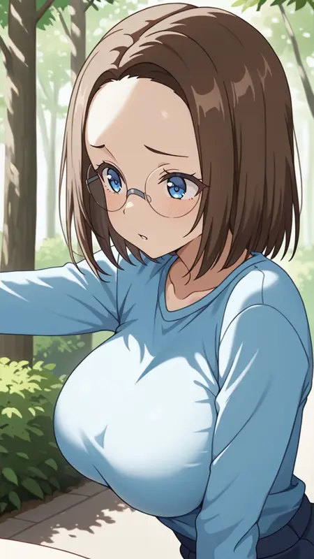 KanamiOikawa, medium hair, bob cut, brown hair, blue eyes, glasses, large breasts, forehead, sidelocks