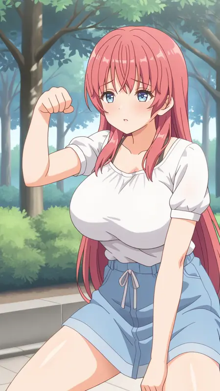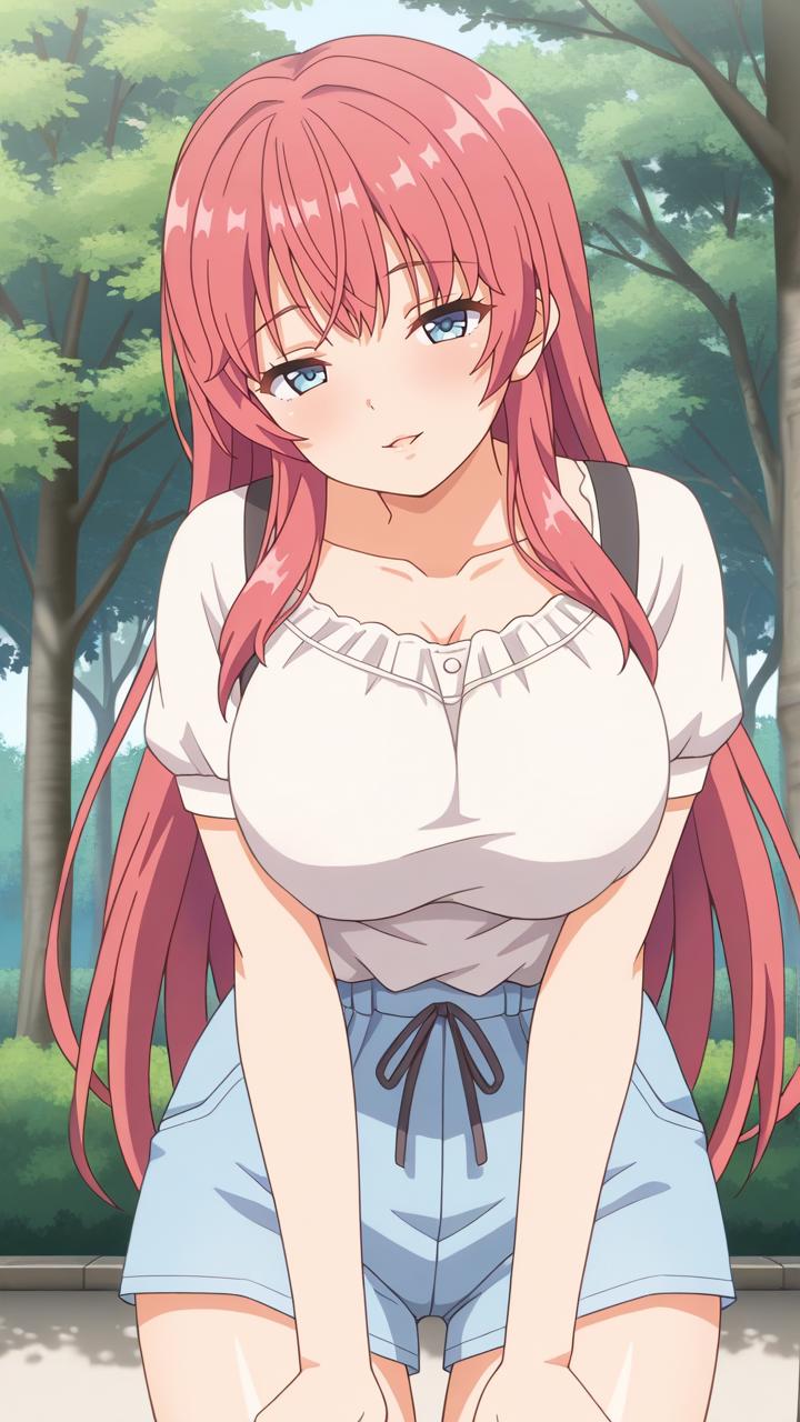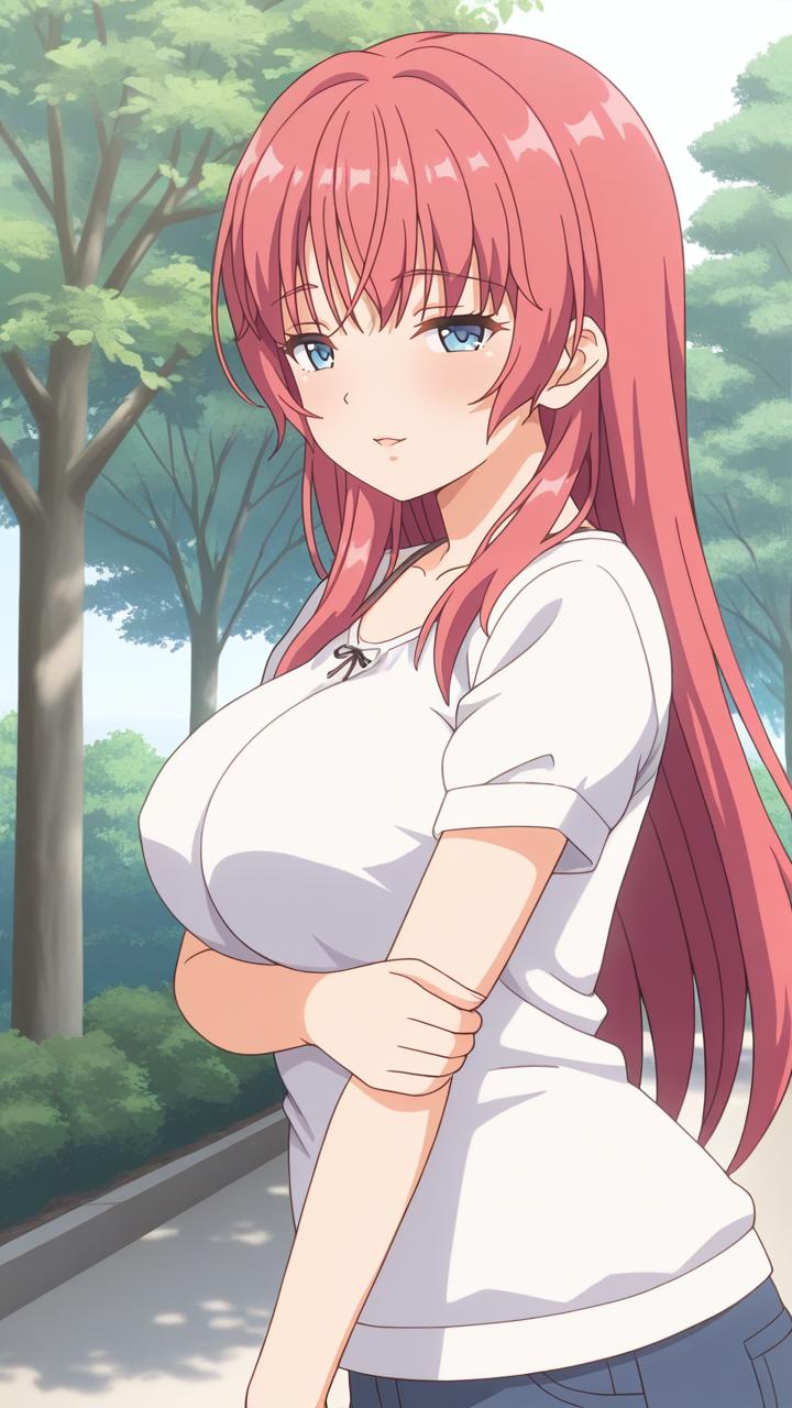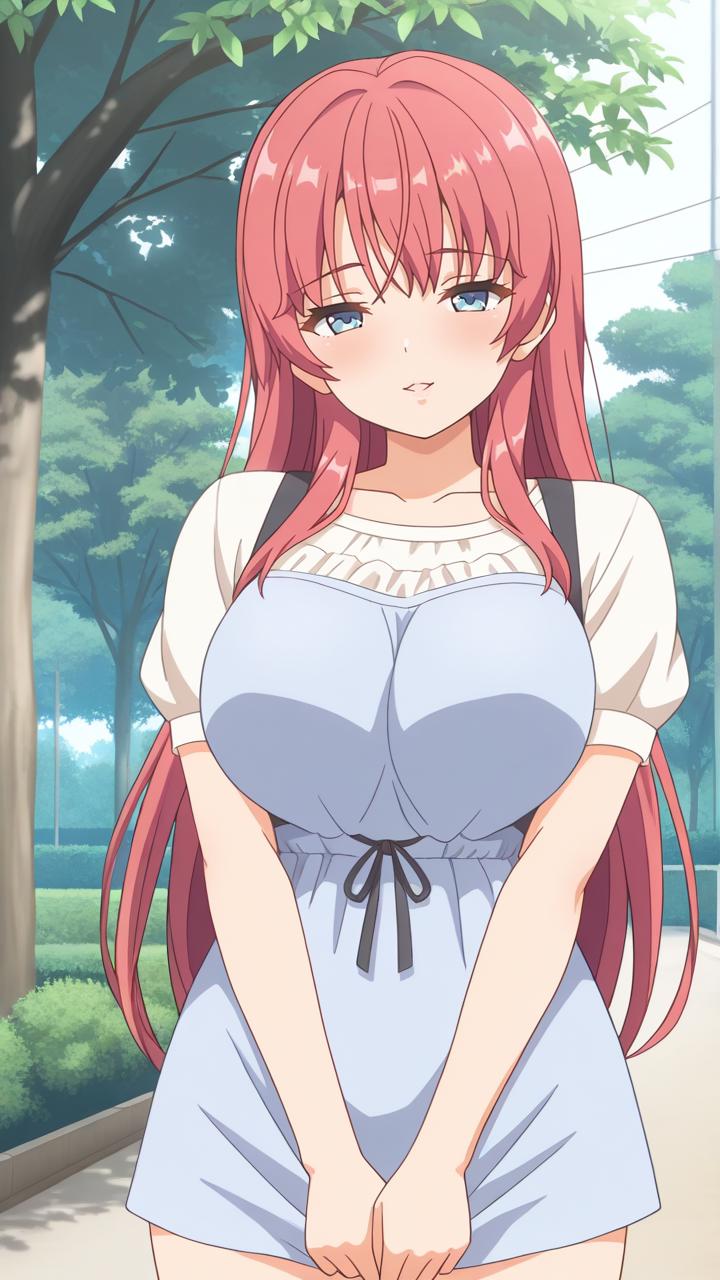 MakiSanjou, very long hair, red hair, hair bangs, sidelocks, blue eyes, big breasts,