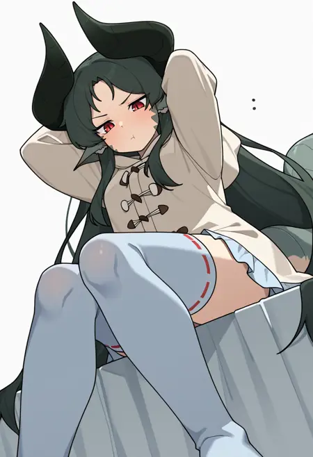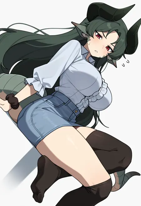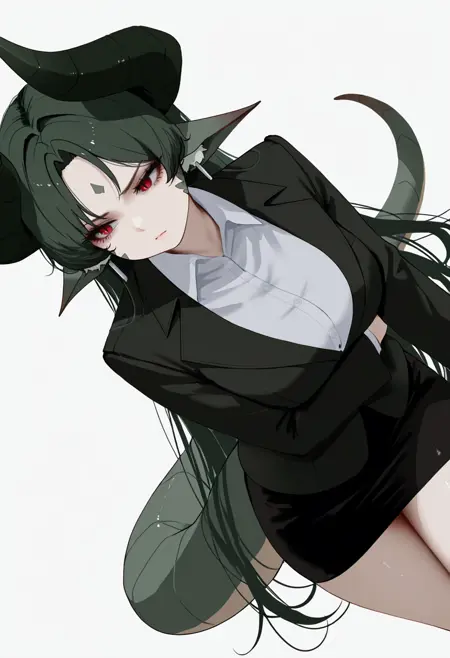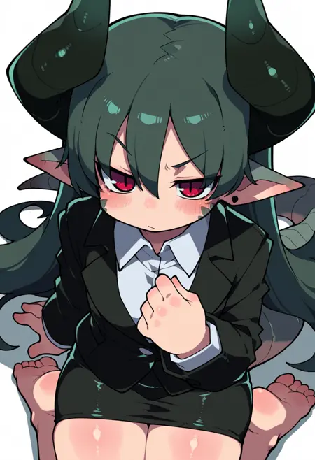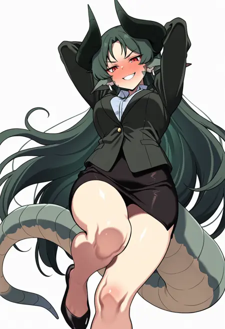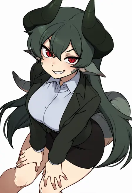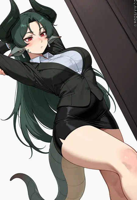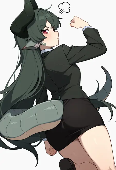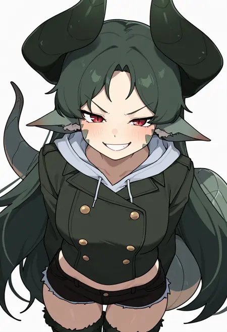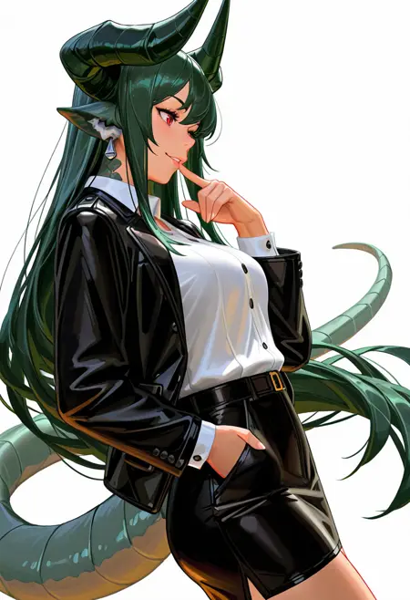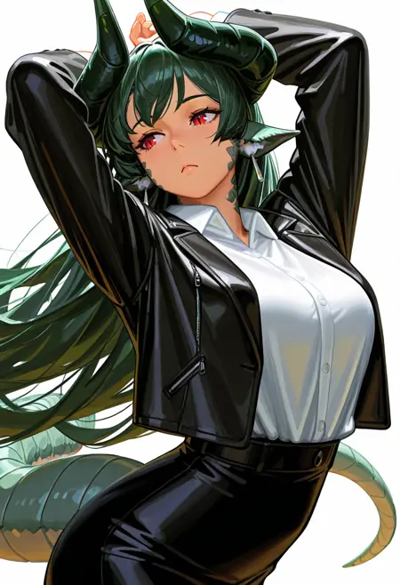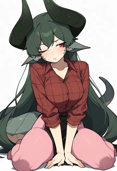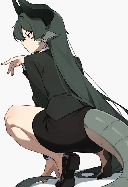 behemont_cnr, 1girl,dragon girl,very long hair, green hair, red eyes, slit pupils, scales, animal ears, dragon horns, dragon tail,