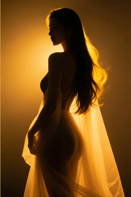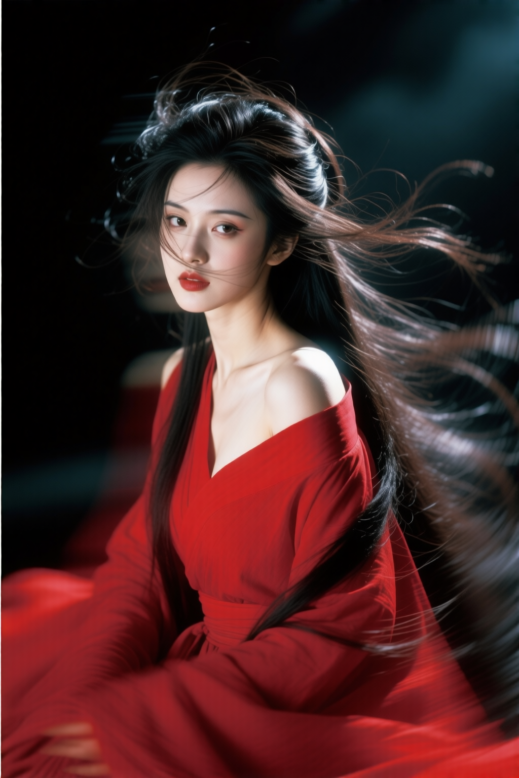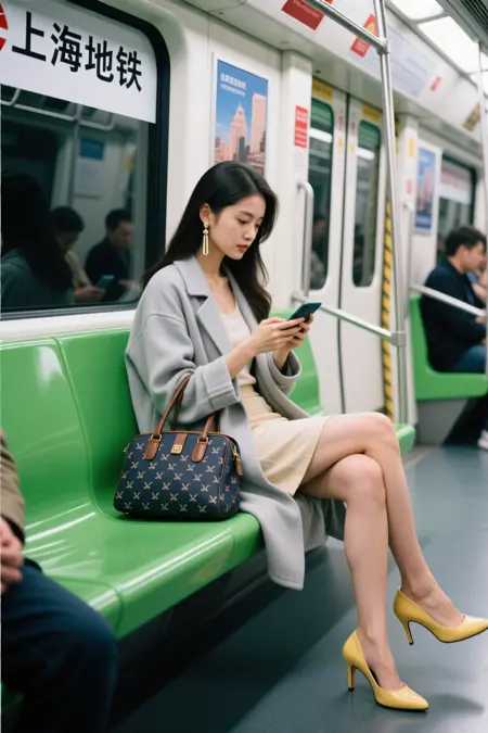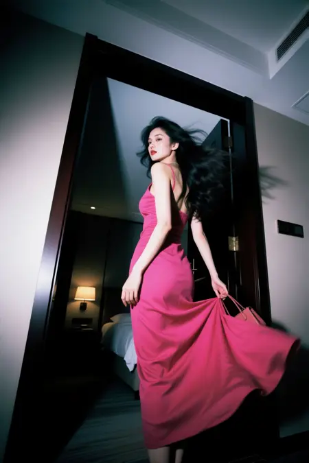 사진: 슬림한 몸매의 아시아계 여성. 검은색 긴 머리카락을 하고 있으며, 꼭 맞고 반짝이는 검은 라텍스 드레스를 입고, 네이비 색 고급 하이힐을 신고 있다. 우아한 검정색 메르세데스-벤츠 밴에서 나서는 모습이며, 표정은 평온하다. 배경은 밤의 도시 풍경이다.