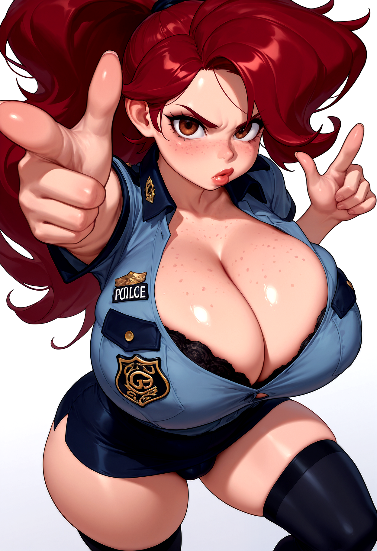 police uniform, alternate costume, short skirt, bra peek, black bra, cleavage, overflowing breasts, bursting breasts, (cleavage bulge:1.2), police badge, thighhighs, zettai ryouiki,