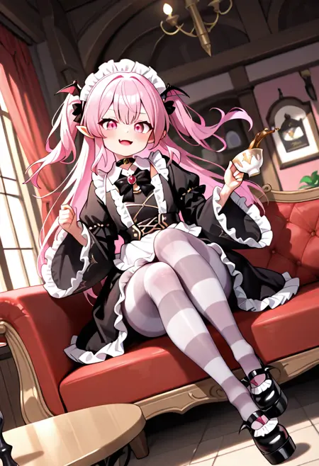 aisa_ph,1girl,solo,pink hair,long hair,two side up,pointy ears,pink eyes,vampire,fang,maid headdress,black dress,frilled dress,long sleeves,puffy sleeves,wide sleeves,black bow,black bowtie,striped pantyhose,shoes,platform footwear,black footwear,brooch,bat hair ornament,floating book,open book,chain,holding umbrella,black umbrella,frilled umbrella,