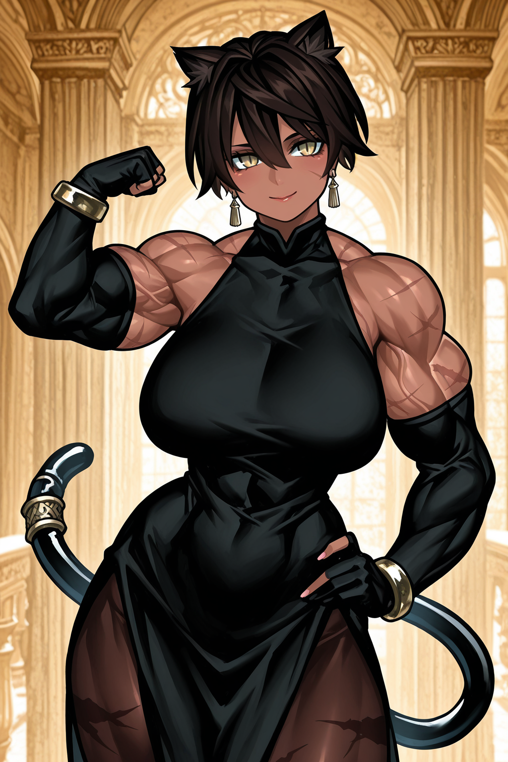 마오 트리거: mao, 검은 피부, 근육질의 여성, 큰 가슴, 동물 귀, 흰색 동물 귀 털, 꼬리, 꼬리 링, 갈색 머리, 단발, 눈 사이의 머리, 노란 눈, 수직 동공, 얼굴 흉터, 여러 흉터, 귀걸이, 중국 복장, 어깨 노출, 금팔찌, 손가락 없는 장갑, 검은 장갑, 골반 커튼, 꽃무늬 프린트, 타이트, 허벅지 스트랩, 하이힐