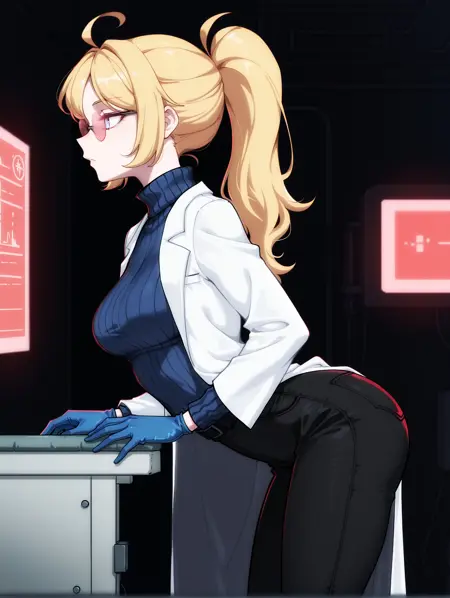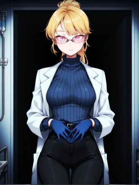 衣装プロンプト:glasses, gloves, lab coat, labcoat, white lab coat, tinted eyewear, blue gloves, ribbed sweater, turtleneck sweater, long sleeves, black pants, tight pants, belt, red-tinted eyewear, white footwear