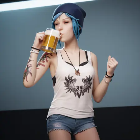 라이프 이즈 스레인의 클로이. 게임의 외관과 더 현실적인 스타일 사이의 중간 지점을 찾으려고 노력했습니다. 학습한 옷은 그녀의 흰색 탱크탑, 갈색 자켓, 찢어진 바지, 그리고 일부 데님 반바지만 사용했습니다.