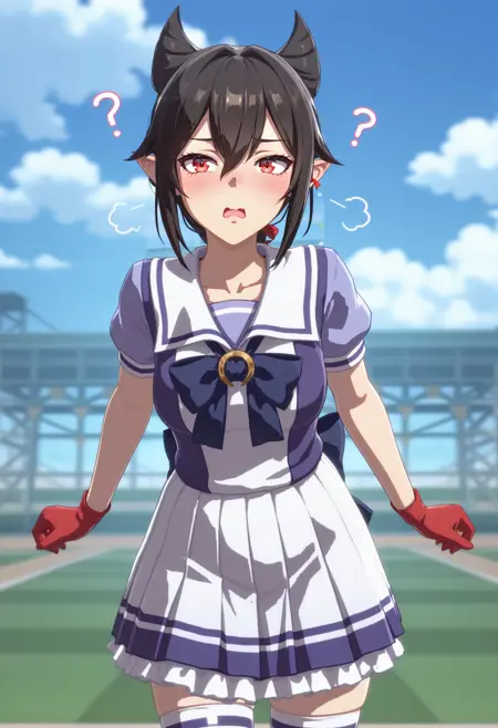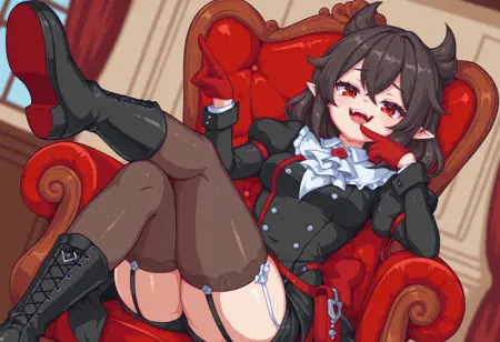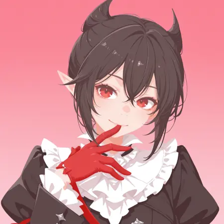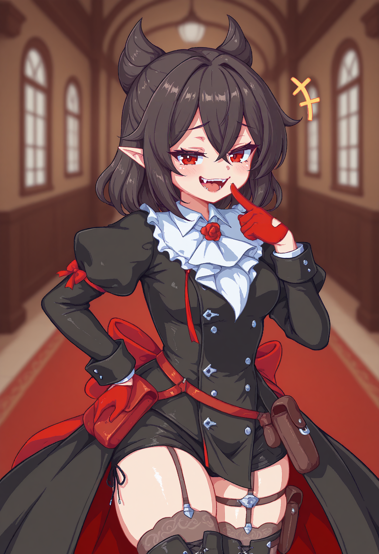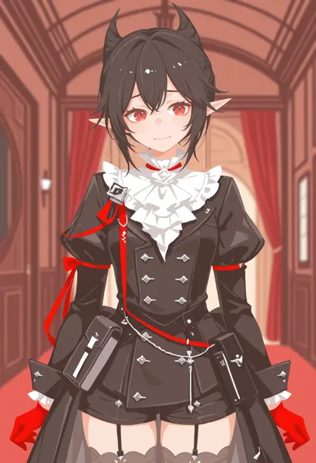 ente1ech1a,红眼睛,手套,红色手套,黑发,白色领结,领结,长袖,衬衫,短裤,褶边,黑色夹克,蓬松袖子,蝴蝶结,过膝袜,靴子,尖耳朵,黑色连衣裙