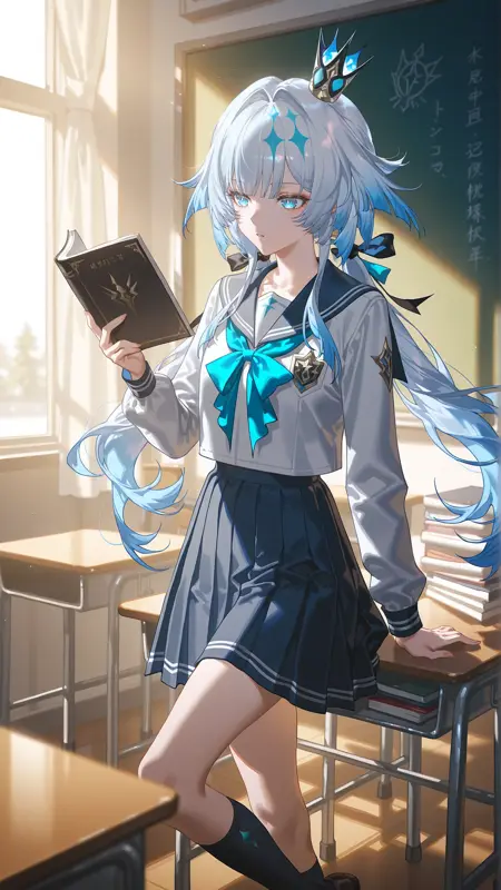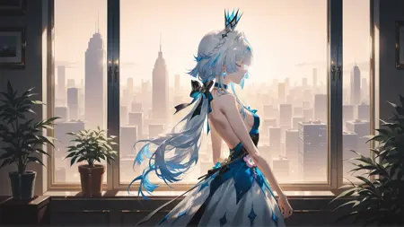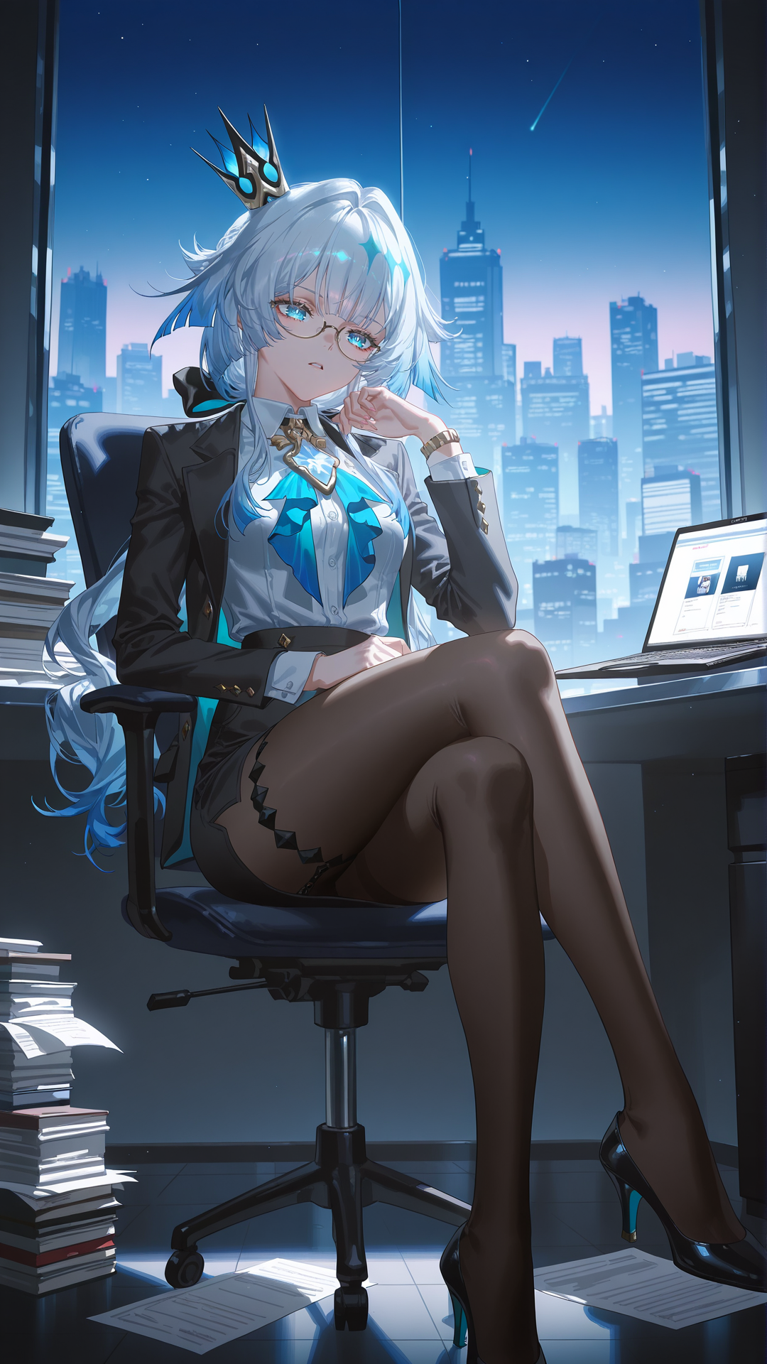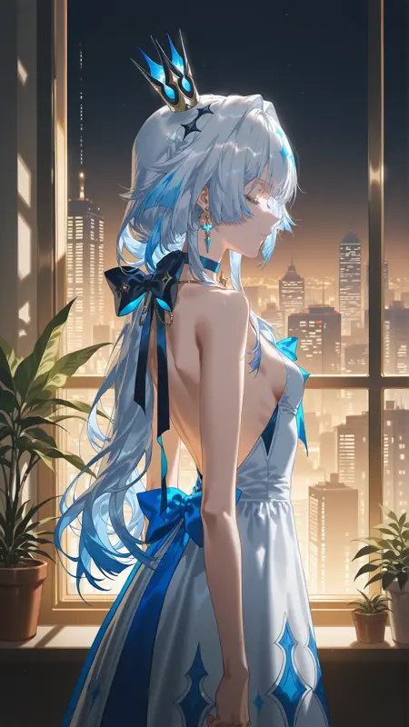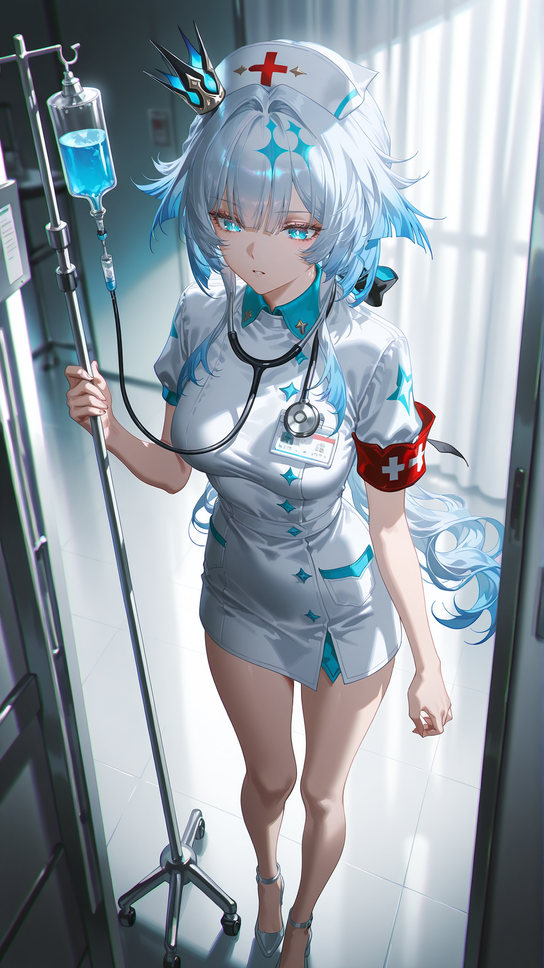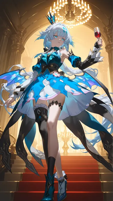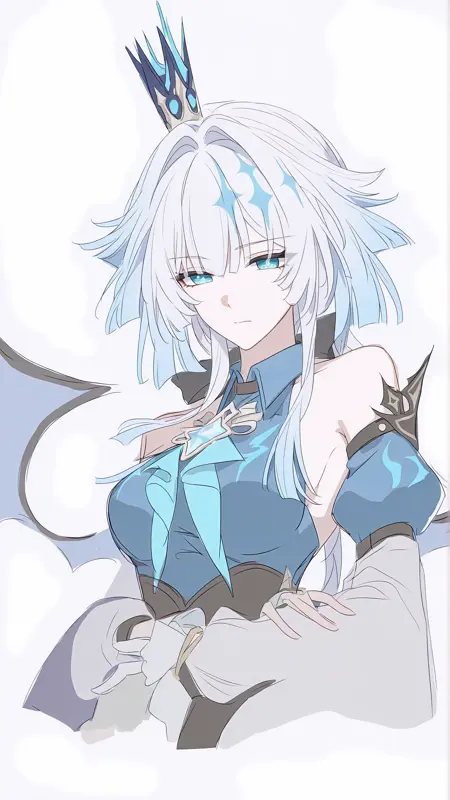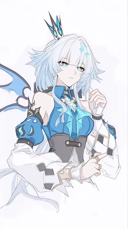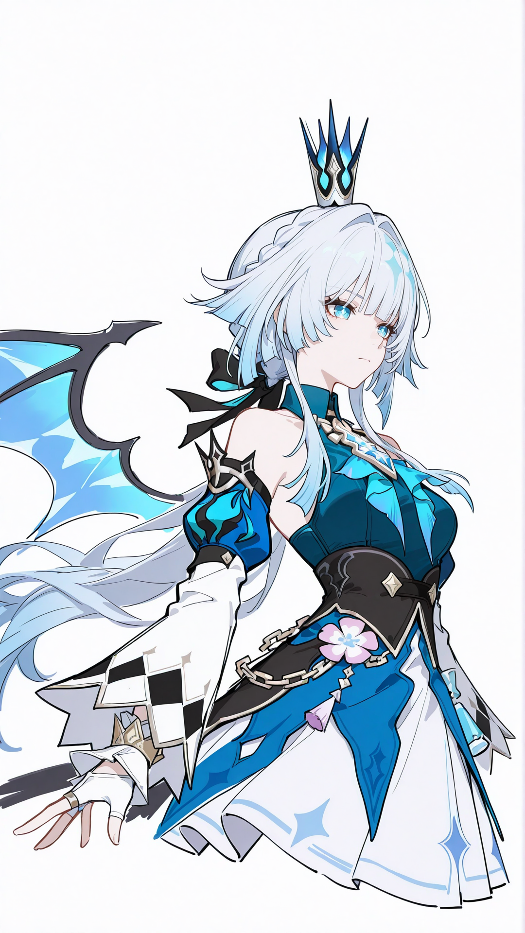 全身: cerydra \(honkai:star rail\),1girl,solo,white hair,blue hair,blue eyes,crown,mini crown,jewelry,