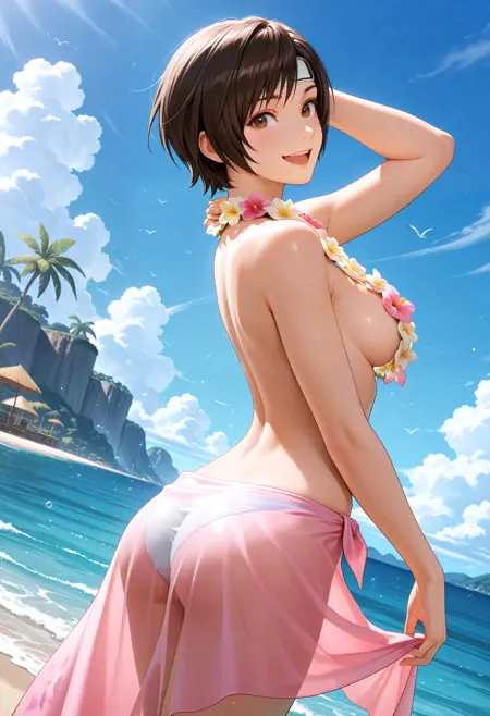 기본 프롬프트: "LilacBikini_Doaxvv, flower necklace, lei, topless, cleavage, bikini skirt, sarong, see-through, bikini bottom"