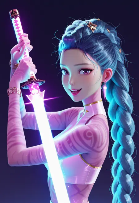 恶魔模式:KPDH_DemonmodeRumi,1个女孩,凌乱头发,长编发马尾,紫发,蓝发,武器,单独一人,剑,彩色皮肤,手持剑,能量剑,紫皮肤,发光武器,裸露肩膀,
