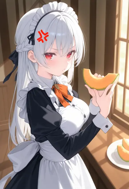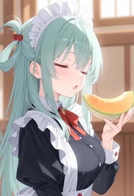 망사 무늬가 있는 넷 멜론을 보여주고, 자르고 먹는 장면을 생성하는 LoRA입니다.