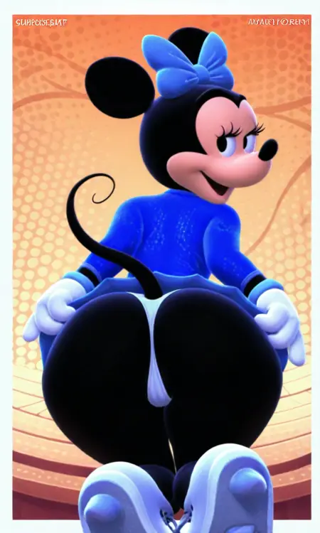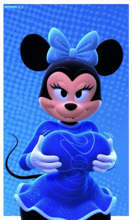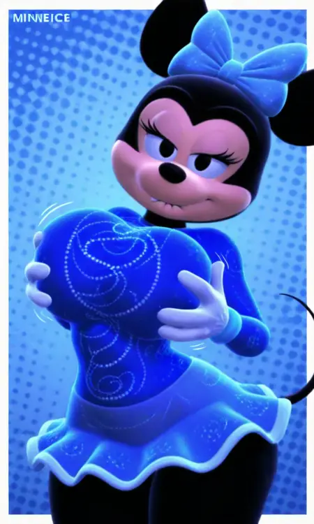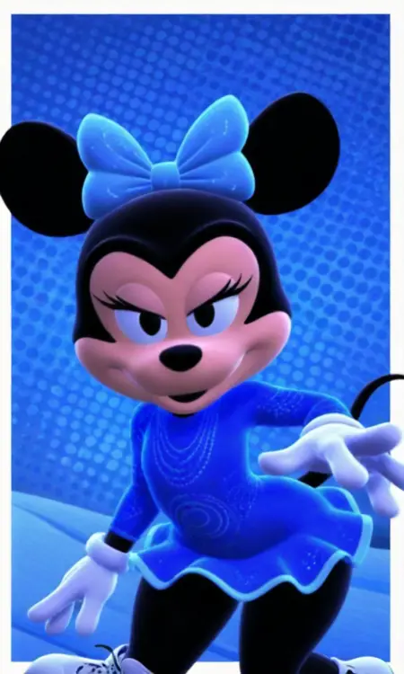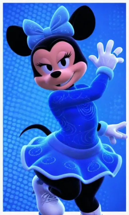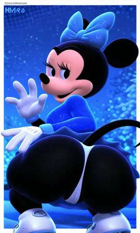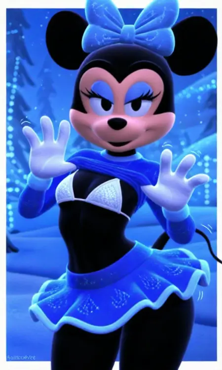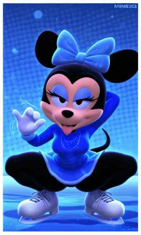 タグ: Minnie_ice、黒い毛、黒い耳、黒い目、青い髪のリボン、ネズミの尾、手袋、青い腕輪、青いボディスーツ、青いスカート、白いアイススケート靴