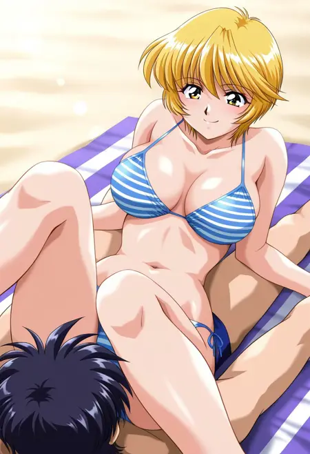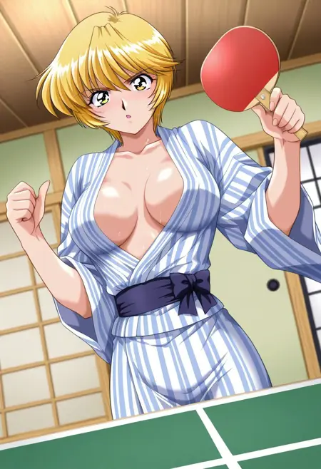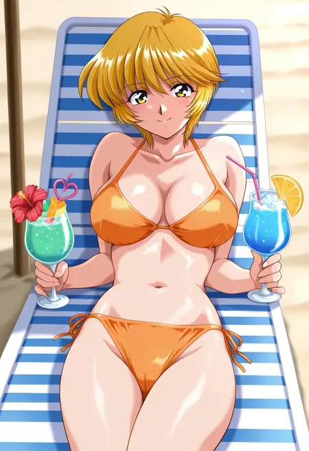 블론드 헤어, 단발, 앞머리, 노랑색 눈, 큰 가슴, 옵션: 1990년대 (스타일)