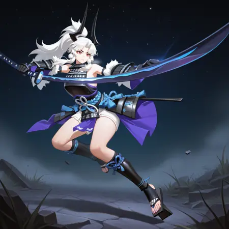 YotoHime, Yhm_Lgt, tengu-geta, black footwear, thick eyebrows, long hair, white hair, red eyes, stirrup legwear, toeless legwear, thigh armor, black kneehighs, kusazuri, knee armor, sode, kneehighs, horns, black horns, high ponytail, long sidelocks, pom pom (clothes), sleeveless, white shorts, short shorts, black chestplate, black armor, armored collar, bare shoulders, detached sleeves, armored skirt, alt japanese armor, o-ring, purple skirt, fur trim, blue rope, purple pelvic curtain, open skirt, short pelvic curtain, obi, black gloves, purple wrist guards,