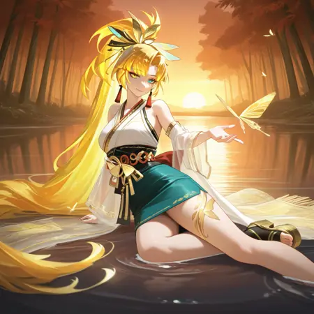 YotoHime, Yhm_Gld, black socks, toeless footwear, gold sandals, platform sandals, absurdly long hair, blonde hair, glowing hair, v-neck, heterochromia, aqua eyes, dress, sleeveless dress, yellow eyes, gold trim, gold butterfly, hair ornament, sleeveless shirt, alt white shirt, japanese clothes, tassel earrings, red tassel, bare shoulders, black sash, sash, back bow, alt red bow, jewelry, wide detached sleeves, see-through sleeves, teal skirt, fringe trim, pencil skirt, leg tattoo, gold tattoo,