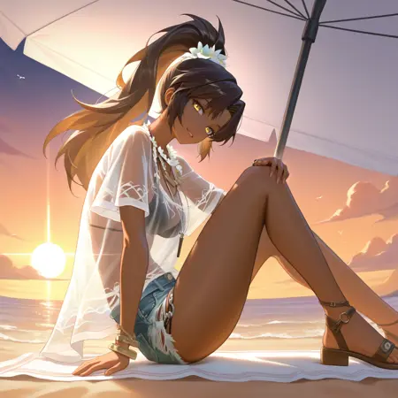 YotoHime, Yhm_Swm, long hair, dark brown hair, high ponytail, hair tie, dark skin, dark-skinned female, see-through shirt, pearl necklace, multiple necklaces, pendant, bracelet, flower necklace, see-through midriff, white flower, white hawaiian shirt, denim shorts, cyan shorts, o-ring thigh strap, long shirt, black bikini, bikini top only, bikini under clothes,