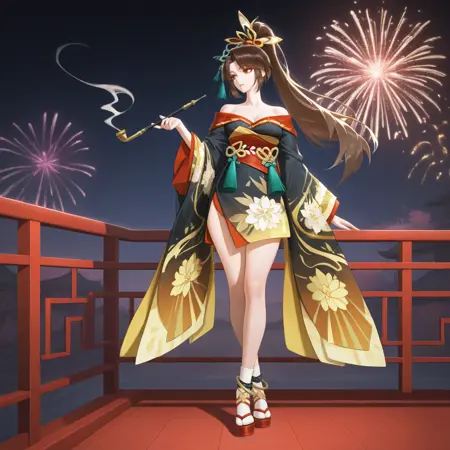 YotoHime, Yhm_Kmn, long hair, brown hair, red eyes, off-shoulder kimono, black kimono, side slit, green tassel, wide sleeves, hair ornament, high ponytail, underbust, red sash, short kimono, print kimono, rope, floral print, sandals, red footwear, platform footwear, anklet, white socks,
