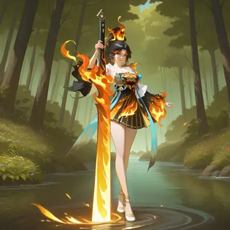 YotoHime, Yhm_Flm, 白色鞋履, 平底鞋, 脚踝链, 额头印记, 长发, 黑发, 高马尾, 中国服饰, 橙色发缕, 条纹发, 火焰, 短裙, 图案, 百褶裙, 多色裙, 条纹裙, 多色裙, 烧焦袖子, 暴露胸部, 火焰印花, 火焰发饰, 火焰服饰, 锁骨, 浅蓝披肩, 披肩, 透明外罩, 白色外罩, 外罩(服装), 短袖叠长袖, 双色袖子, 黑色袖子, 白色袖子, 宽袖, 蓬松袖子,