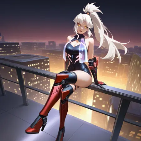 YotoHime, Yhm_Cbr, 高马尾, 橙色眼睛, 白发, 头部装备, 连体衣, 无袖高领连体衣, 多条大腿绑带, 机械靴子, 胸部镂空, 红色护甲手套, 机械手臂, 机械手套, 霓虹镶边, 透明披肩, 红色铠甲, 大腿长靴, 高跟靴,