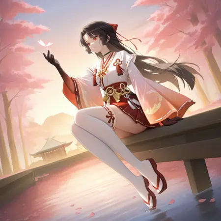 YotoHime, Yhm_Mik, 木屐, 红色木屐, 额头印记, 黑发, 红眼, 巫女, 短袴裙, 红色袴, 缎带边高筒袜, 白色高筒袜, 缎带边袖子, 红色缎带, 黑色项圈, 白色袖子, 粉色袖子, 红色流苏, 黄色蝴蝶结, 发饰蝴蝶结, 红色蝴蝶结, 腰部蝴蝶结, 渐变袖子, 宽袖替代款, 肘部手套, 黑色手套替代款, 白色绳子, 汉服, 白色汉服,