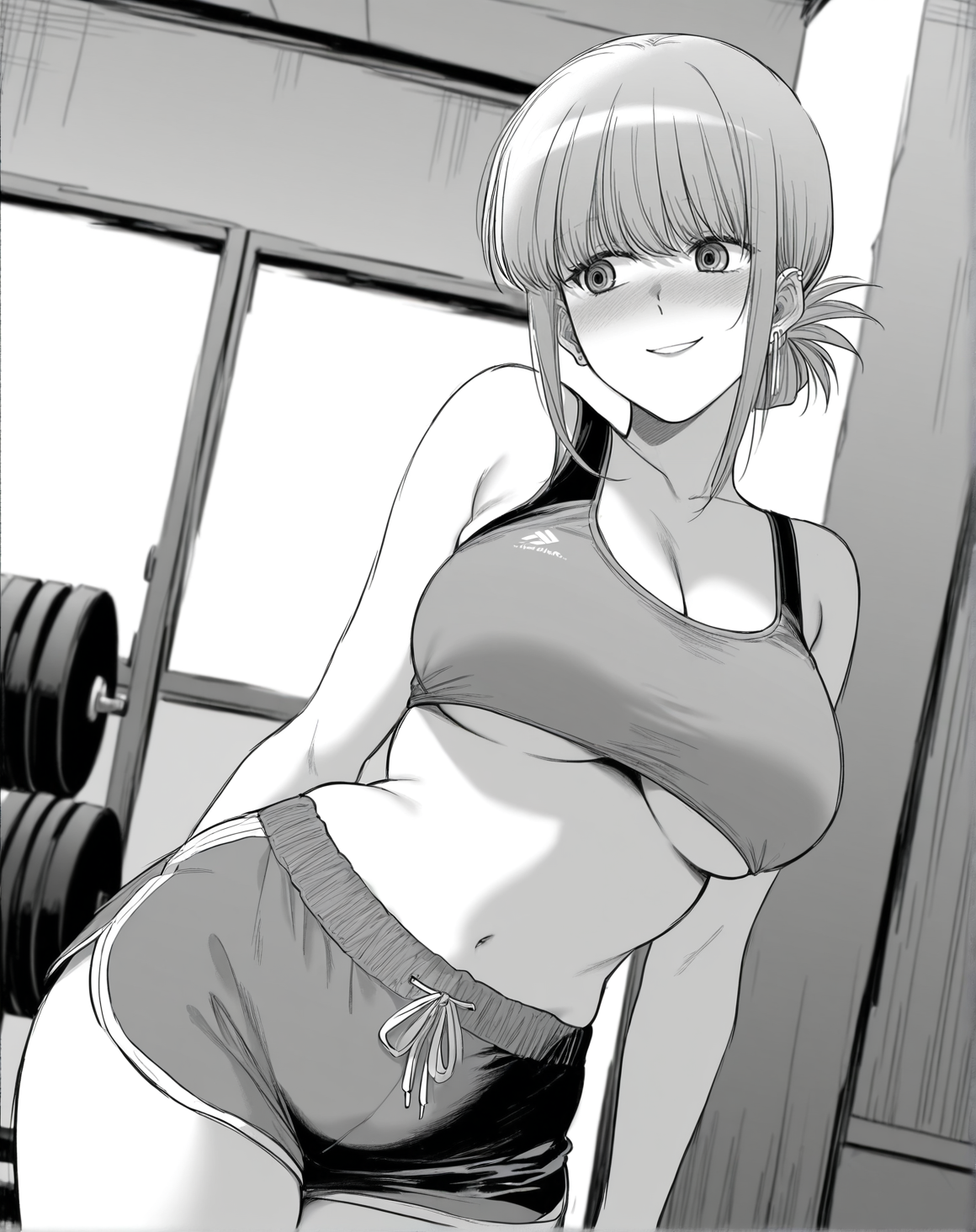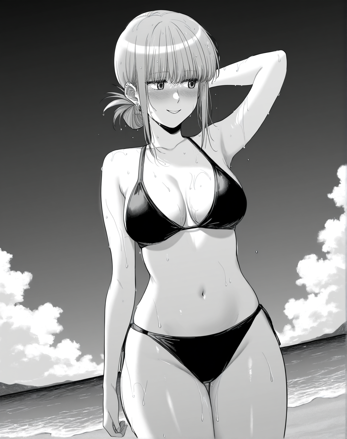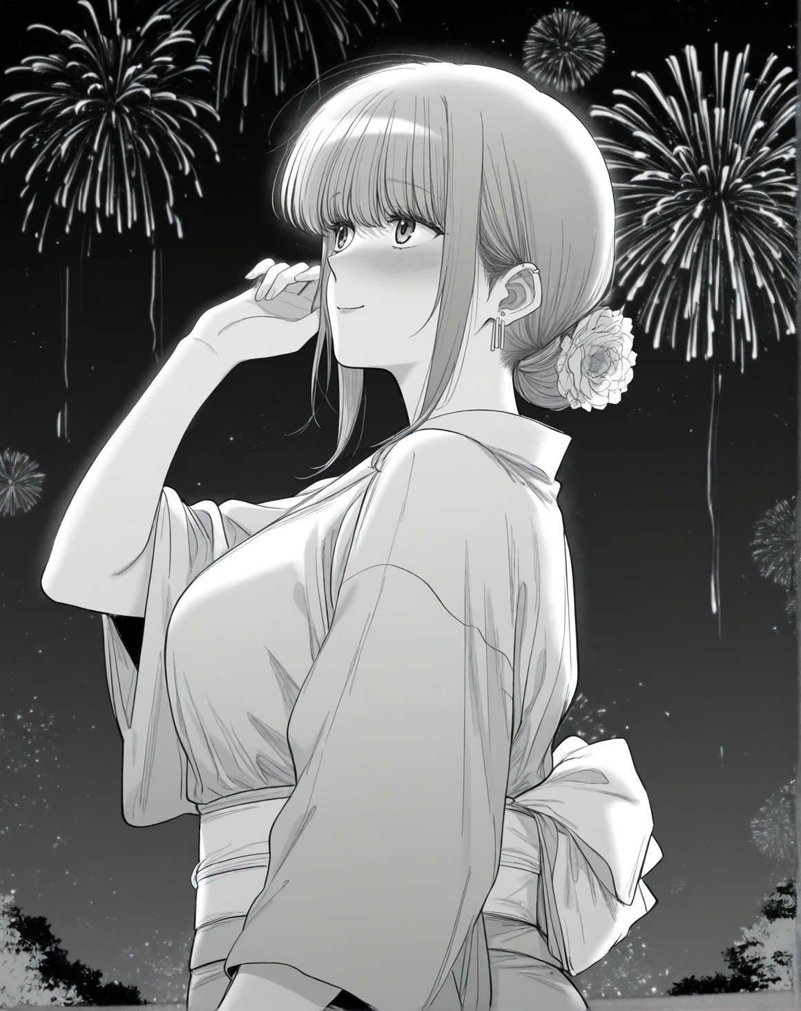 yamadawah、モノクロ、グレースケール、サイドロックス、耳のピアス、ミディアムヘア、折りたたんだポニーテール