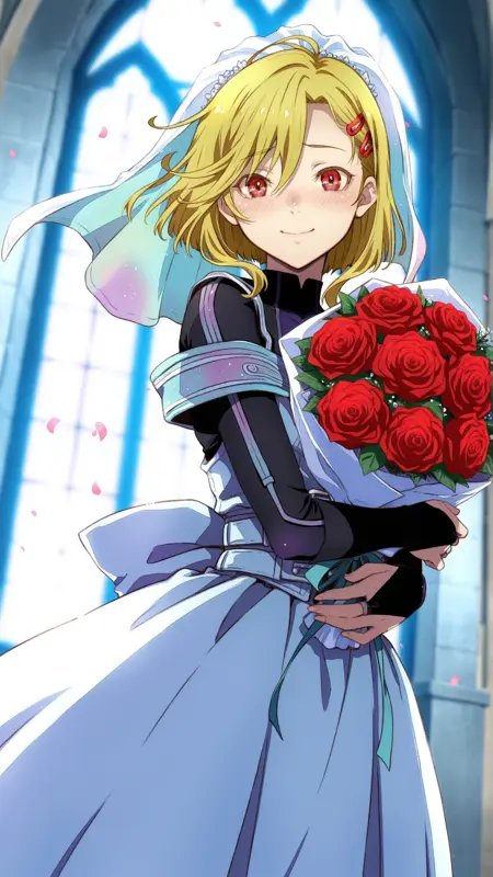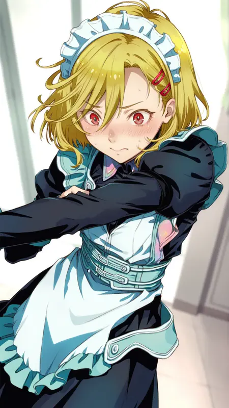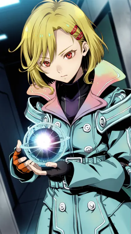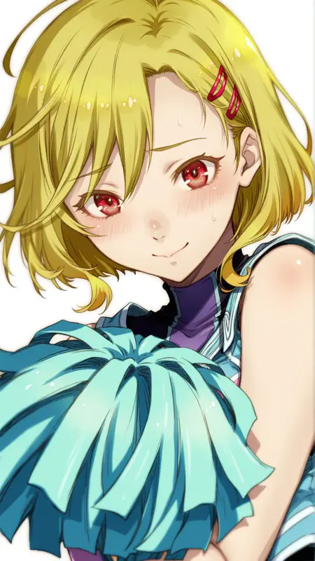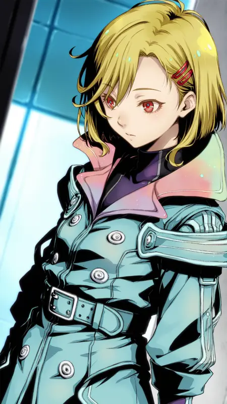 Appearance:blonde hair, red eyes, hairclip,short hair,