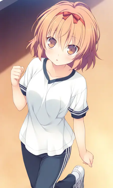 体操服:yuibashi izumi、茶色の目、オレンジ色の髪、ショートヘア、頭にリボン、赤いリボン、スポーツスタイル、短袖、白いアスレチックシャツ、ネイビーブルーのトリム、ネイビーブルーのアスレチックパンツ、白いストライプ、白いソックス、ネイビーブルーのスニーカー、白い靴ひも