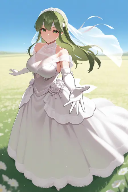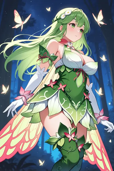 화려한 기본 팔라를 원하면 "replpl, 녹색 머리카락, 긴 머리카락, 녹색 눈, 머리꽃, 흰색 꽃, 잎 드레스, 층층 드레스, 짧은 드레스, 소매 없음, 가슴 노출, 녹색 팔찌, 팔꿈치 장갑, 흰색 장갑, 곤충 날개, 잎 허벅지 양말, 허벅지 부츠"를 추가하세요.
