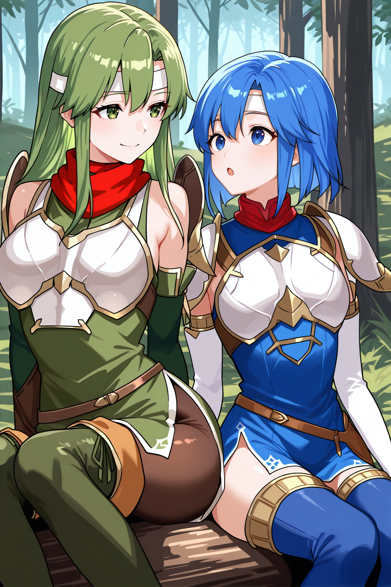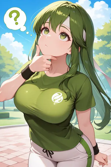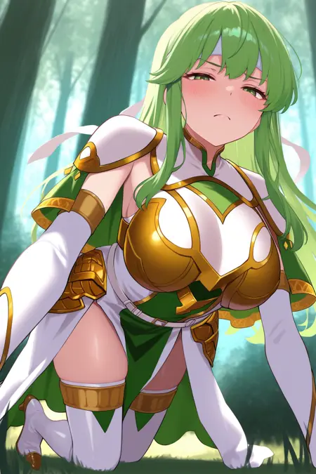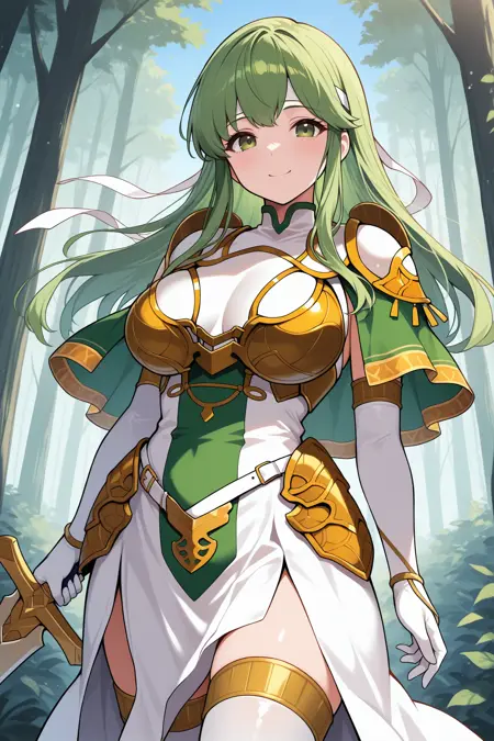 기본 외모를 원하면 "defpl, 녹색 머리카락, 긴 머리카락, 녹색 눈, 흰색 헤드밴드, 흰색 갑옷, 어깨 갑옷, 가슴갑옷, 빨간 스카프, 녹색 드레스, 짧은 드레스, 사이드 슬릿, 분리형 소매, 녹색 소매, 분리형 소매, 갈색 장갑, 갈색 벨트, 갈색 팬티후스, 허벅지 부츠, 녹색 부츠"를 추가하세요.