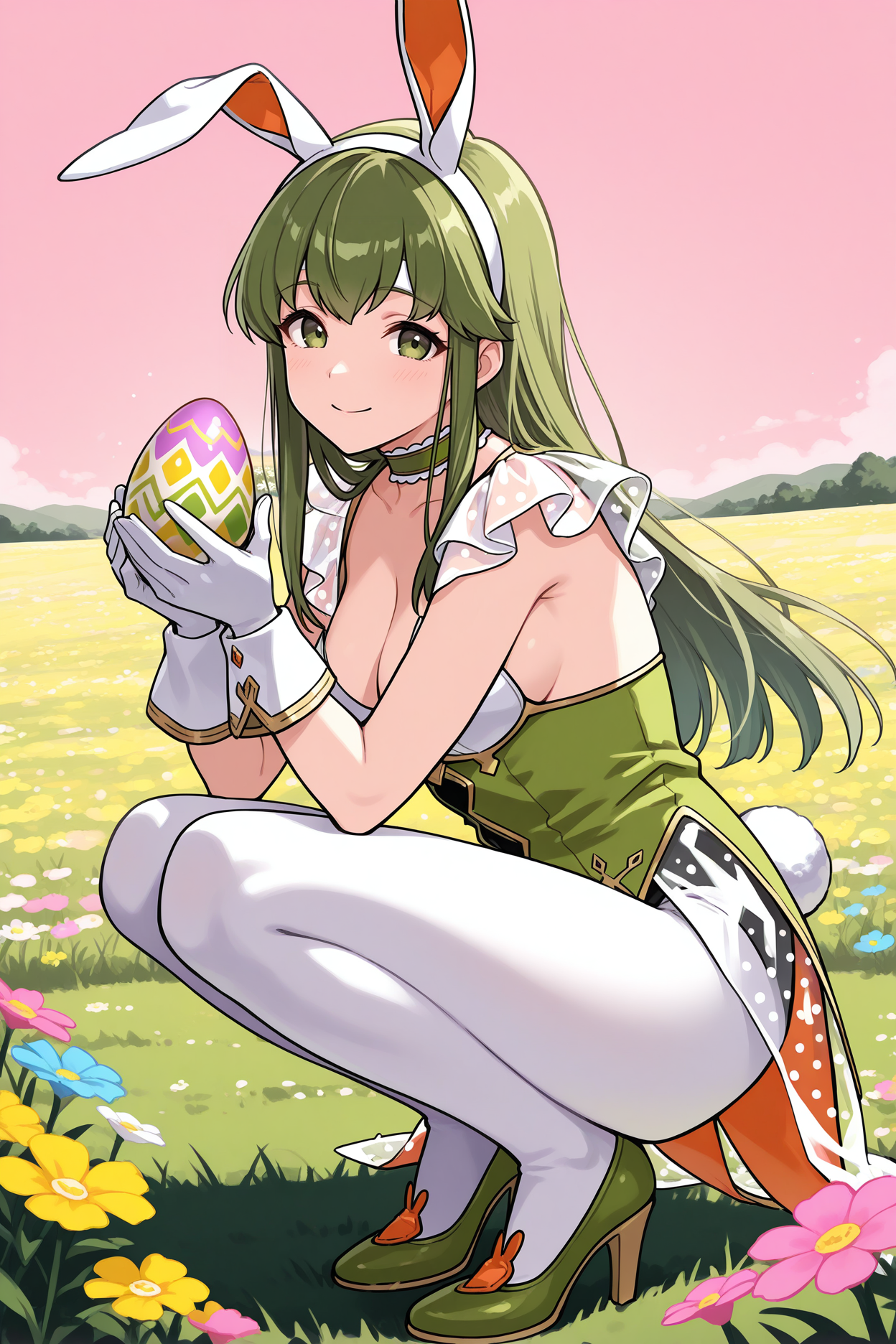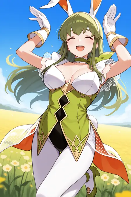 봄 팔라를 원하면 "sprnpl, 녹색 머리카락, 긴 머리카락, 녹색 눈, 가상 동물 귀, 토끼 귀, 녹색 카이저, 주름진 카이저, 투명 소매, 짧은 소매, 플레이보이 버니, 녹색 레오타드, 투명 쇼걸 치마, 흰색 장갑, 흰색 팬티후스, 녹색 하이힐, 토끼 꼬리"를 추가하세요.
