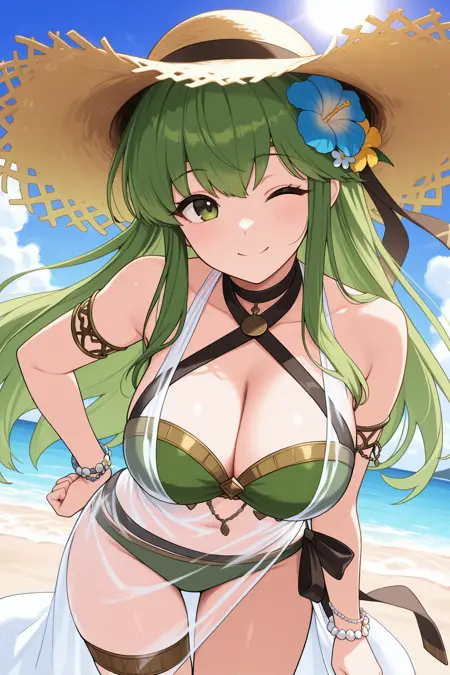 여름 팔라를 원하면 "smmpl, 녹색 머리카락, 긴 머리카락, 녹색 눈, 짚모자, 머리꽃, 검은 카이저, 십자형 헬터, 녹색 비키니, 투명 드레스, 팔찌, 허벅지 스트랩, 팔찌, 샌들"을 추가하세요.