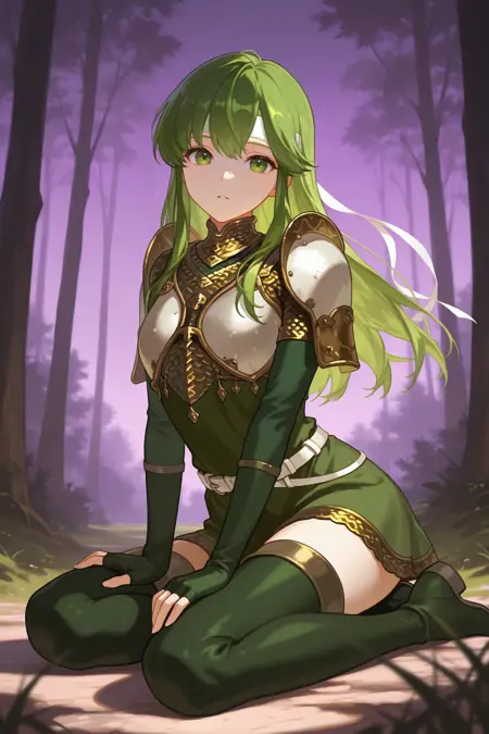 기본 외모를 원하면 "defpl, 녹색 머리카락, 긴 머리카락, 녹색 눈, 흰색 헤드밴드, 흰색 갑옷, 어깨 갑옷, 가슴갑옷, 빨간 스카프, 녹색 드레스, 짧은 드레스, 사이드 슬릿, 분리형 소매, 녹색 소매, 분리형 소매, 갈색 장갑, 갈색 벨트, 갈색 팬티후스, 허벅지 부츠, 녹색 부츠"를 추가하세요.